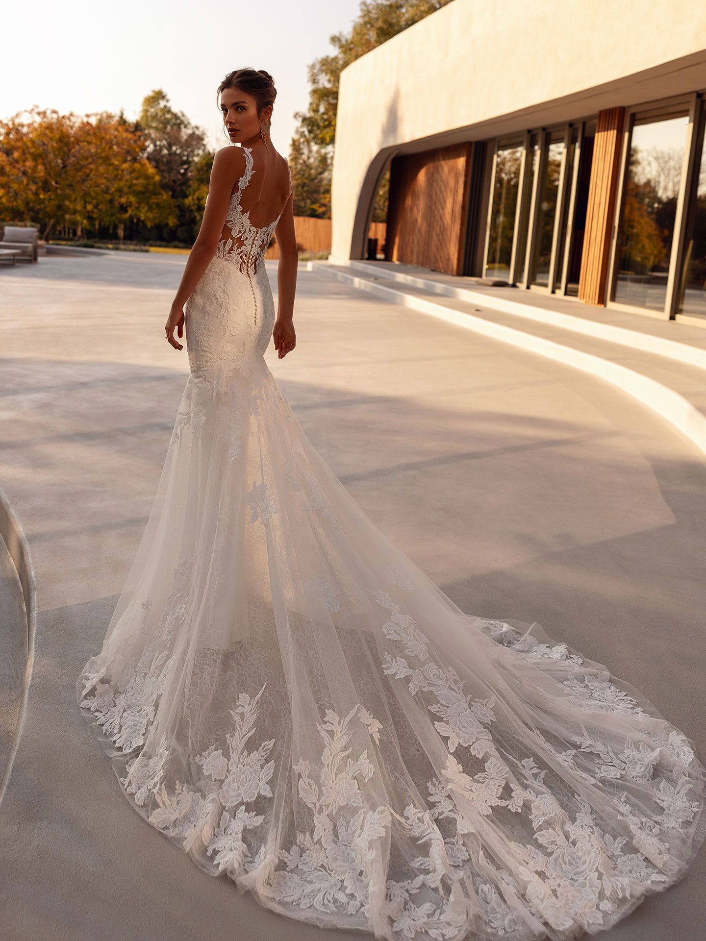 Anders als bei dem A-Linien Brautkleid, betont der taillierte Schnitt die weiblichen Kurven bis zur Mitte der Oberschenkel und setzt die Silhouette der Braut damit perfekt in Szene. Der restliche Rock umschmeichelt fließend die Beine der Braut, sodass noch genug Bewegungsfreiheit bleibt. Aber auch ein ausgestellter Tüll-Rock ab der Oberschenkelmitte ist bei den figurbetonten Brautkleidern möglich. Durch so einen ausgestellten Rock erhält das Hochzeitskleid eine besondere Extravaganz und kombiniert auf diese Weise figurbetonte Elemente mit einem Hauch von märchenhaftem Stil eines Prinzessinnen Brautkleids. Eine fließende Schleppe rundet diesen Look optimal ab.